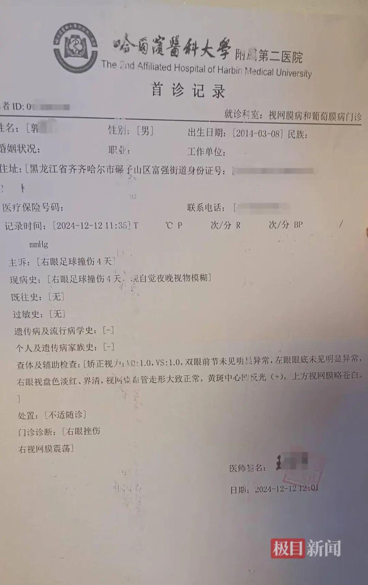 宋女士告诉极目新闻记者,郭同学今年11岁,目前就读于齐齐哈尔市碾子山区第一小学六年级。2024年12月9日,郭同学和同班的几名学生趁着课间在学校操场踢足球。其间,张同学在发球时后退几步,助力小跑踢足球,不慎伤到了郭同学的右眼,导致他眼前一片漆黑,存在恶心、头晕等不适反应。随后,几名学生将郭同学搀扶到教室。