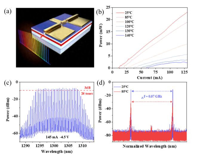 该项工作不仅在实验上验证了在单一芯片上同时实现超高宽带、耐高温、长寿命和高集成度量子点光频梳的可行性,更为下一代数据中心与AI算力集群的光互连系统,提供了一条性能强大且兼具高经济效益的光源实现路径。