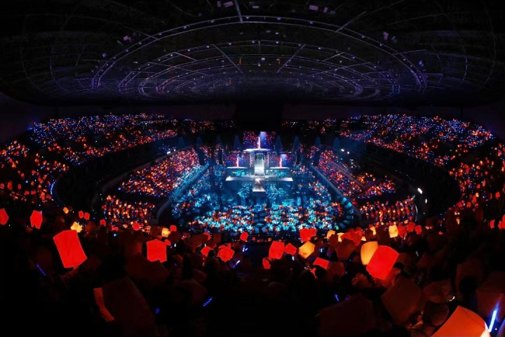 3万支荧光棒把现场染成淡蓝色的海洋。