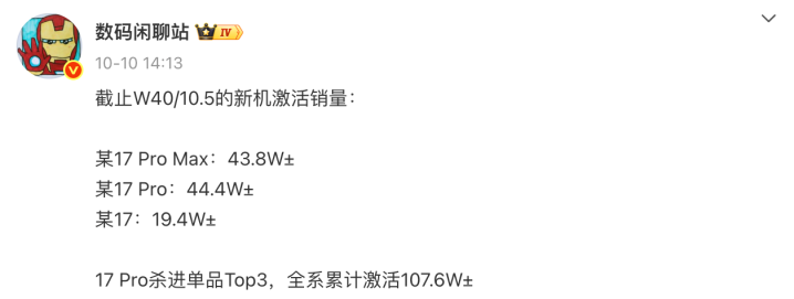 先看苹果,iPhone 17 系列 9 月 10 日发布,9 月 19 日开售。截至今年第四十周(10 月 5 日),开售 16 天国内累计激活 269.5W 左右。具体到单机型——